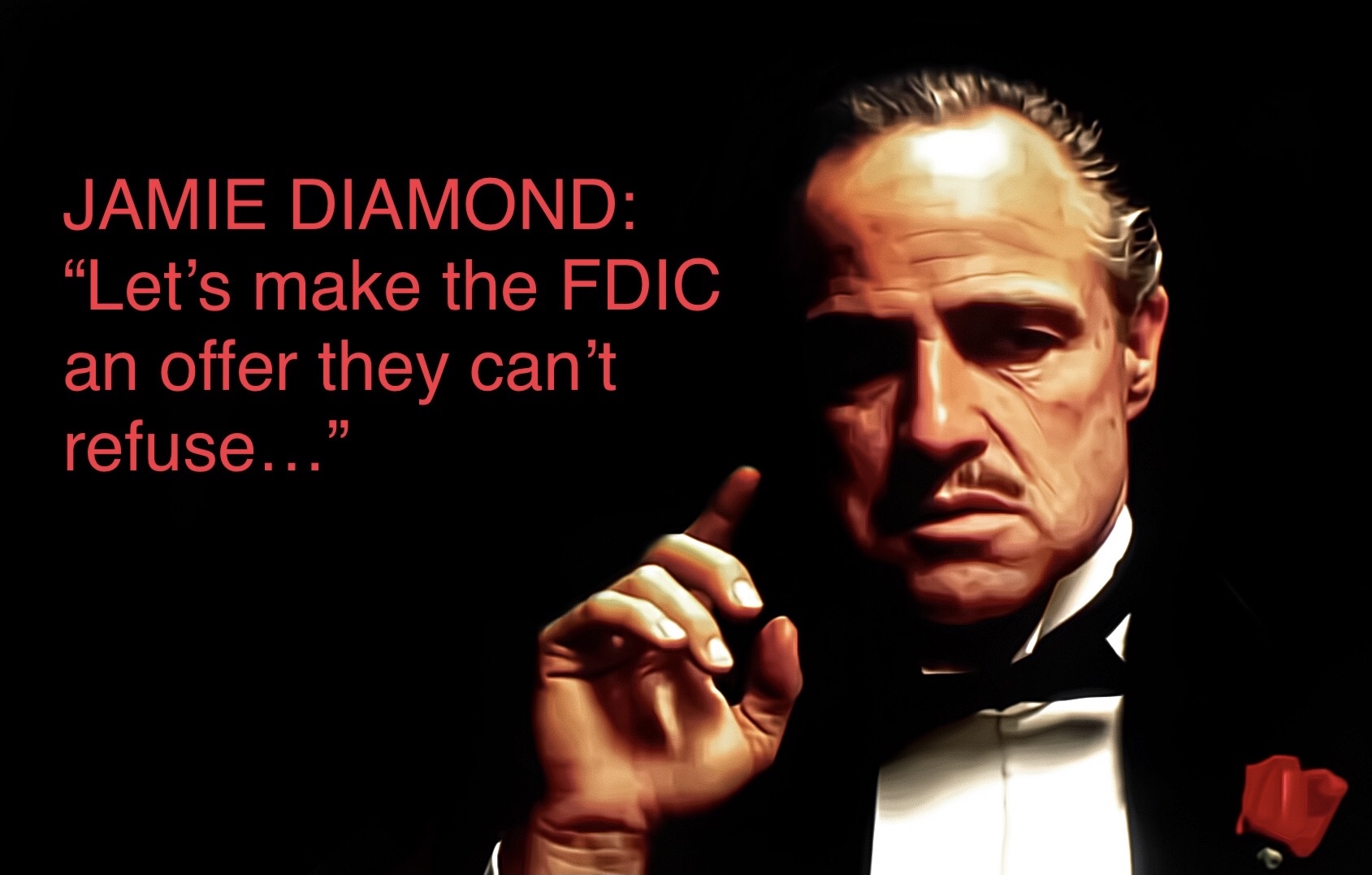 – JPM bought FRB, getting all the “healthy” assets and deposits for pennies on the dollar and the FDIC (meaning everyone with bank deposits nationwide) kept the toxic assets.